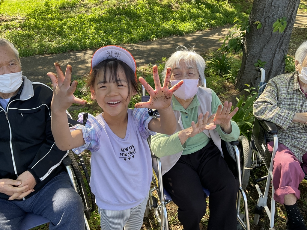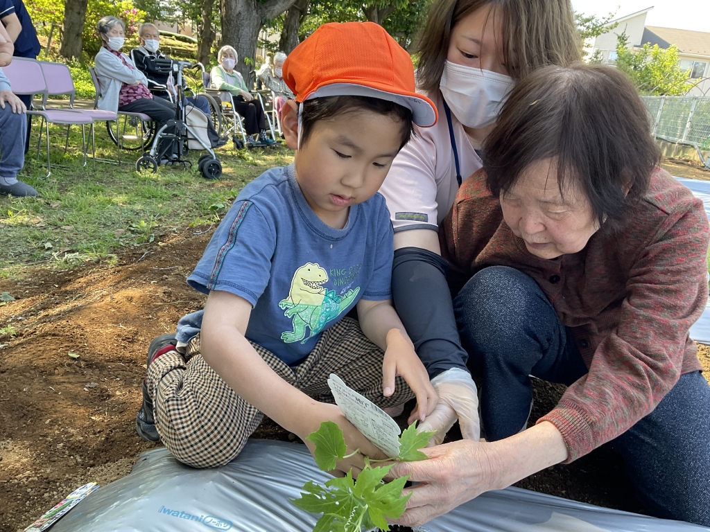 5/8(木)保育園児とデイサービスの御利用者様で、さつま芋苗植えを行いました。