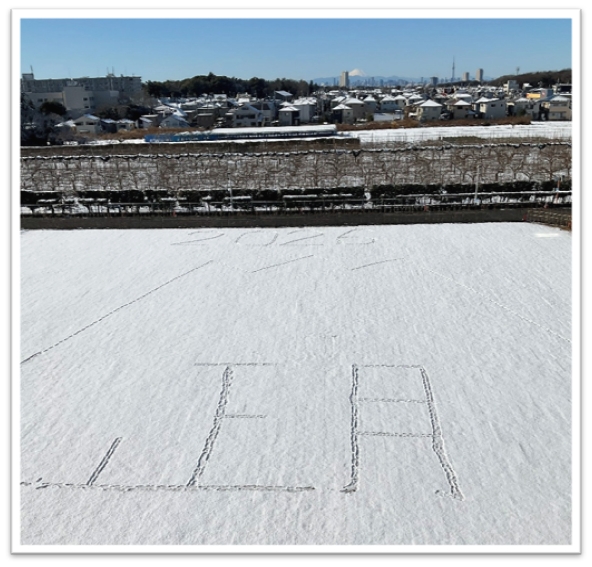 初雪で出来た白いキャンパスに職員が新年のメッセージを作成しました。